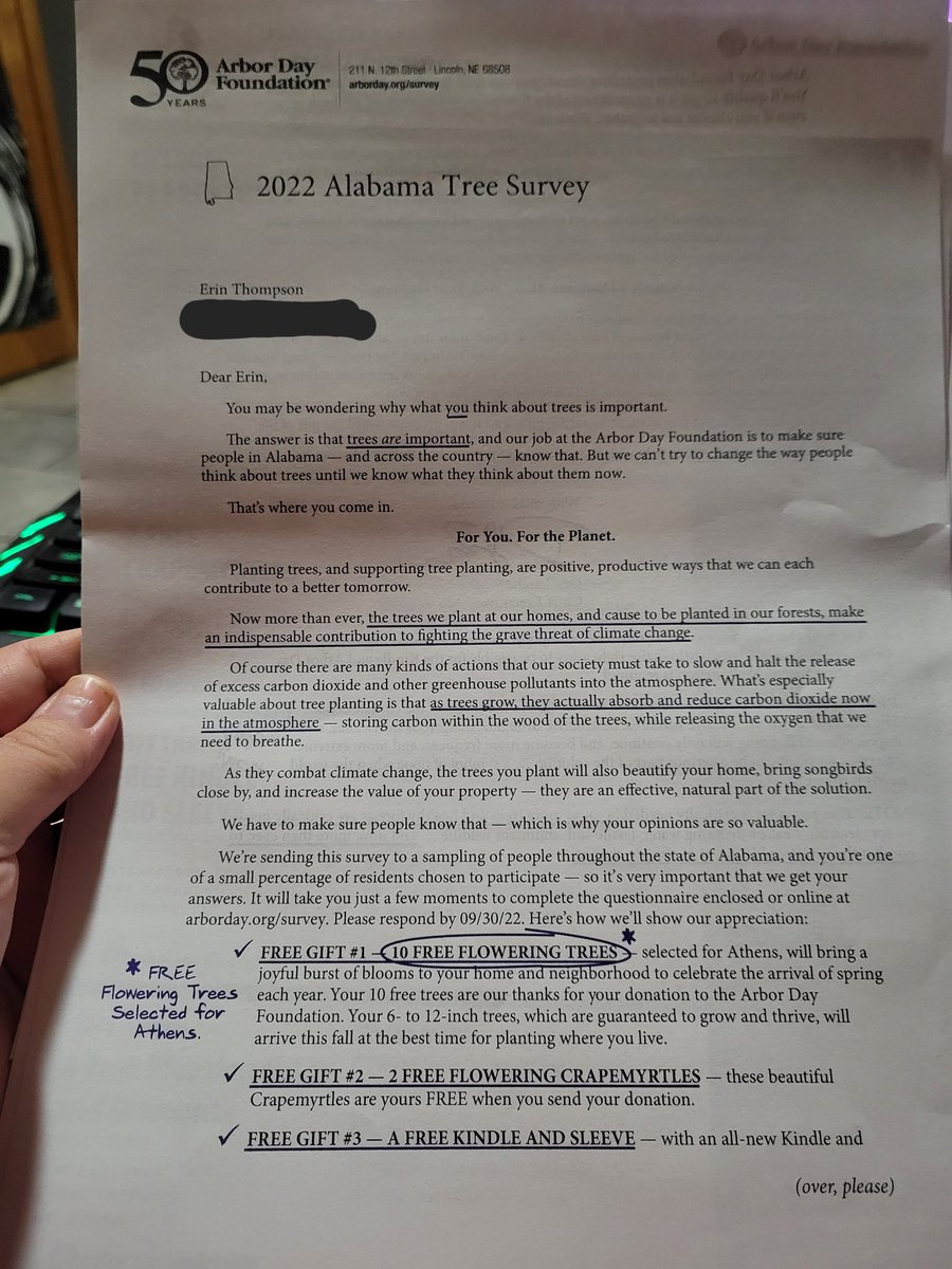Has Anyone Ever Received And Completed An Arbor Day Tree Survey I Completed It Because They Said They Re Sending Me A Bunch Of Trees And Entered For Free Stuff Did I Hit